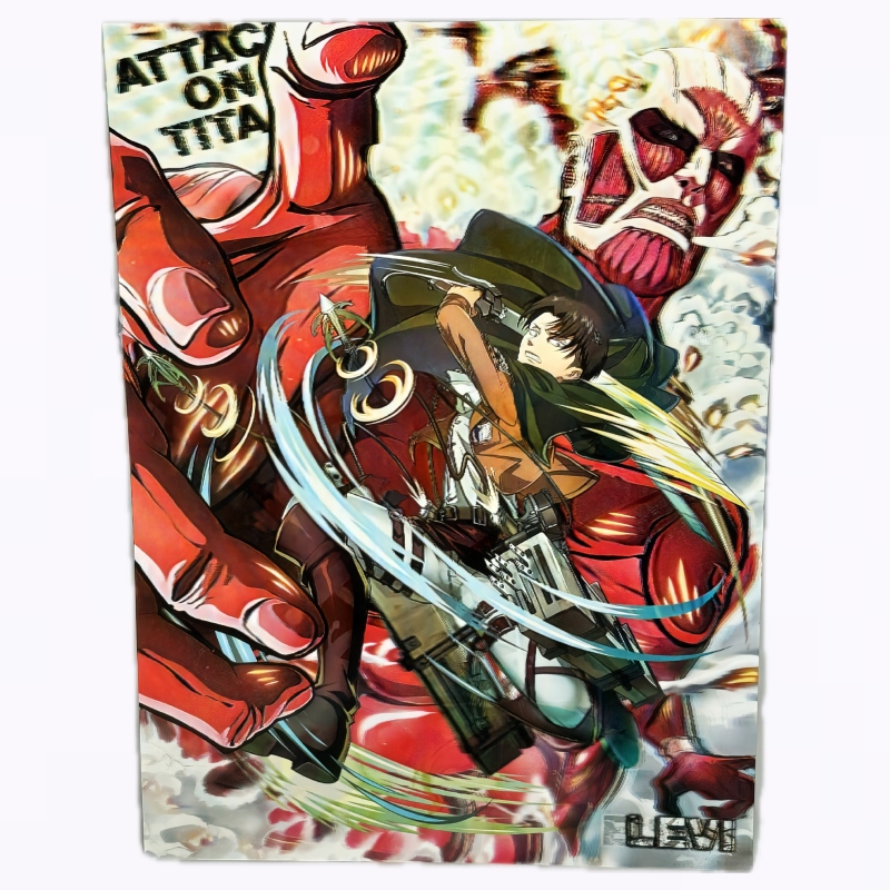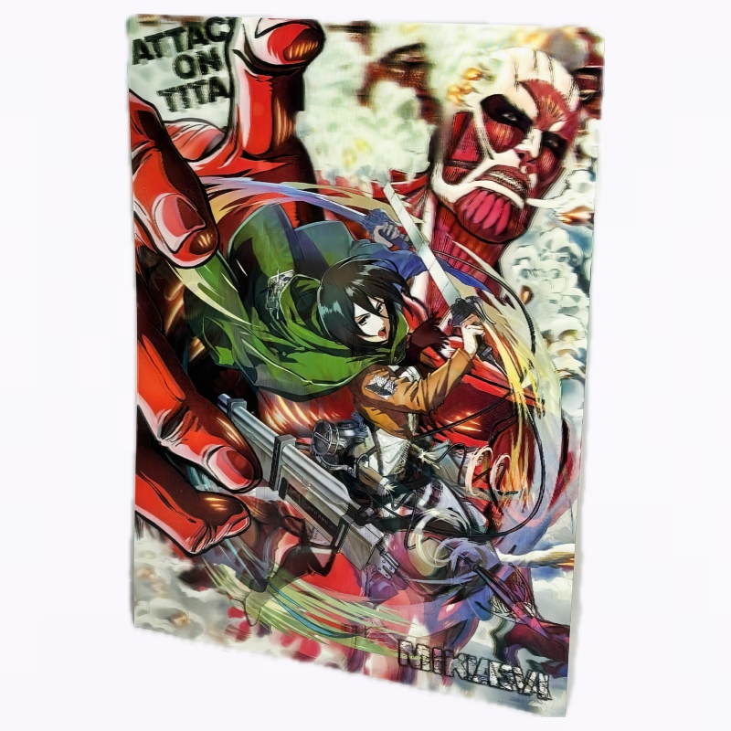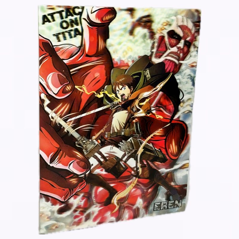 Póster 3D lenticular de Eren, Levi y Mikasa atacando al Titan Colosal de la famosa serie de manga y anime Attack on Titan.